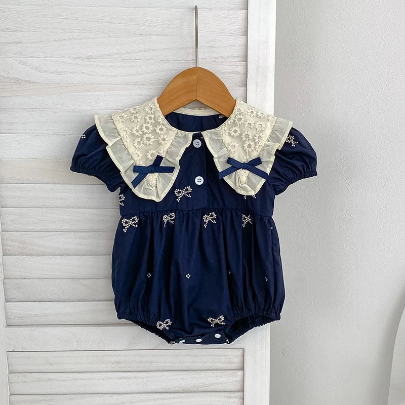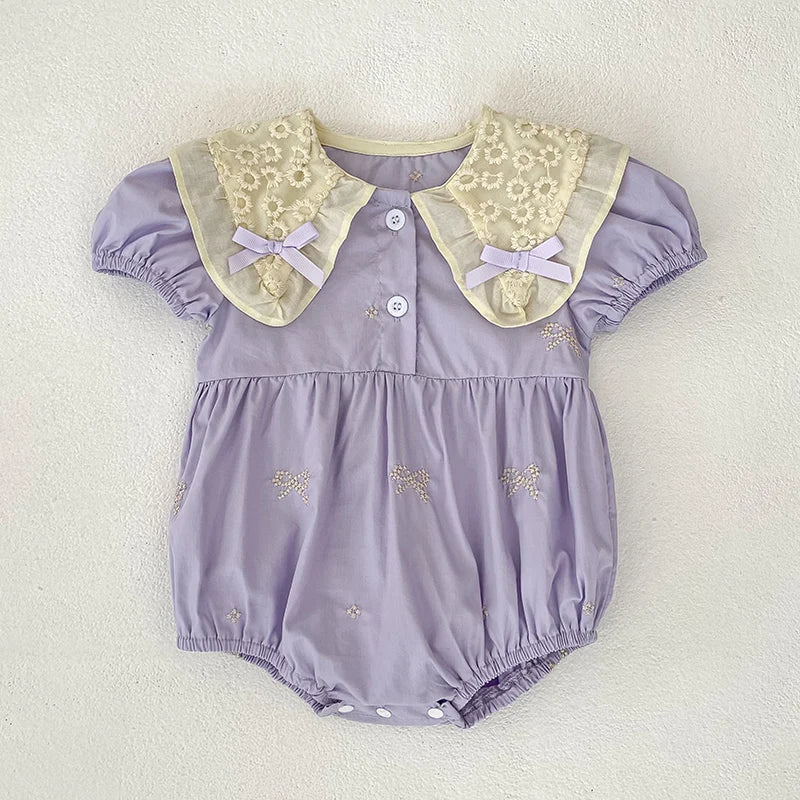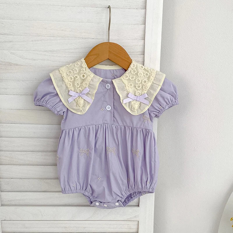 Adorable cotton baby girl, infant, toddler puff sleeve rompers with lace collar and bow details.