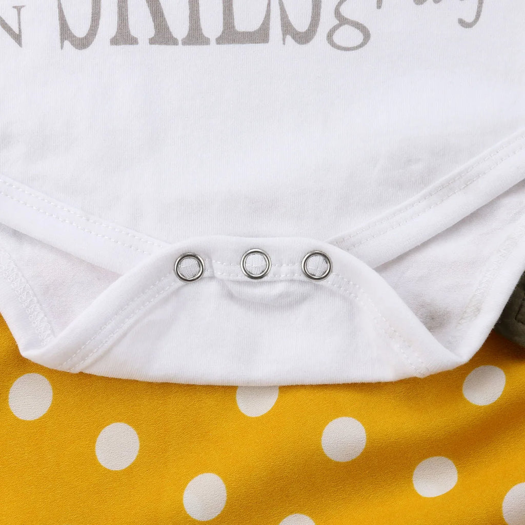 Adorable cotton letter yellow baby girls toddlers clothes set; pants, long sleeve rompers and headband set.