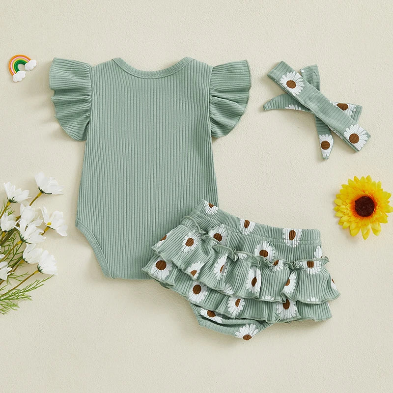 Package includes: 1 rompers + 1 ruffle bloomers with daisy print + 1 headband